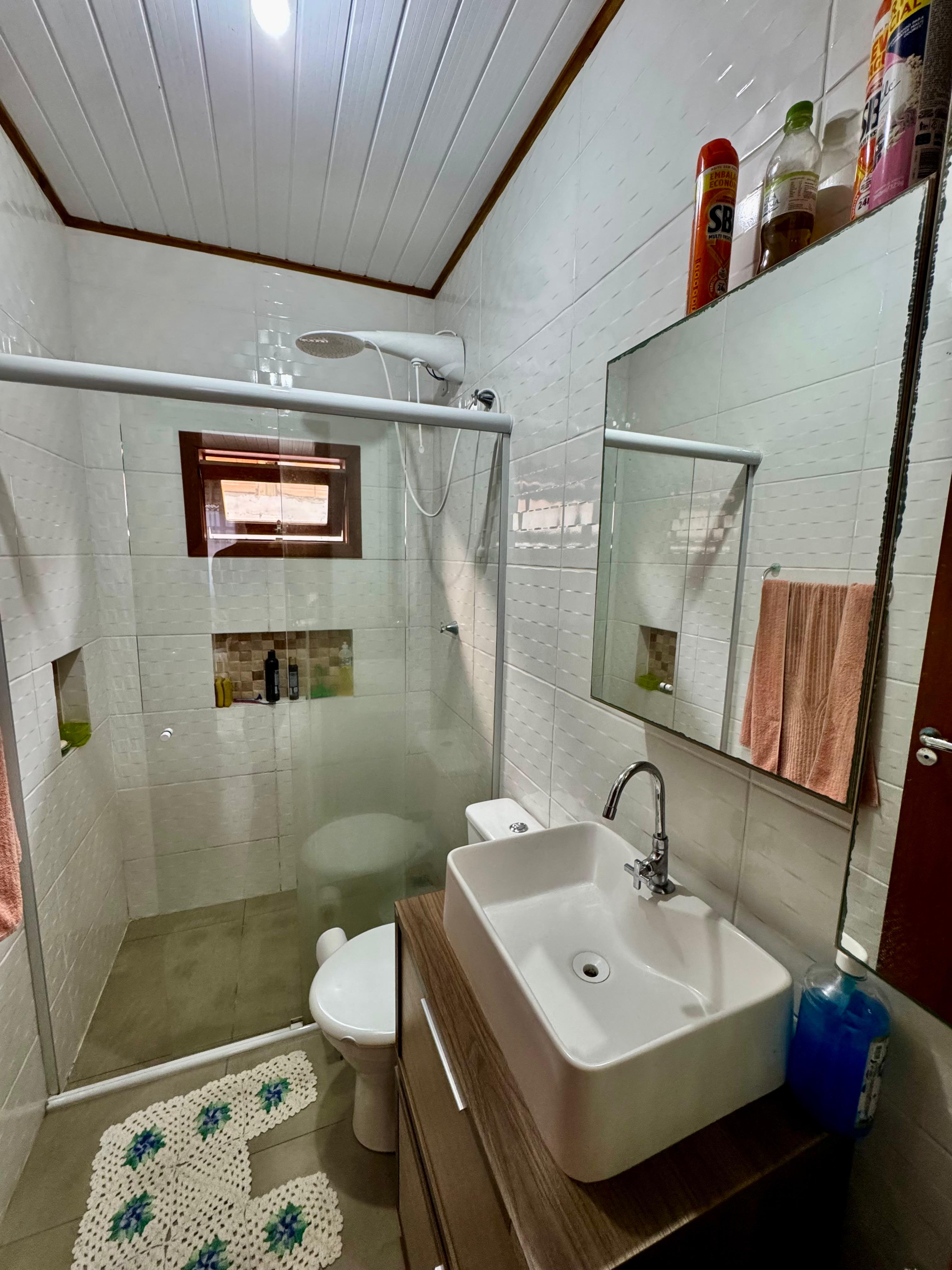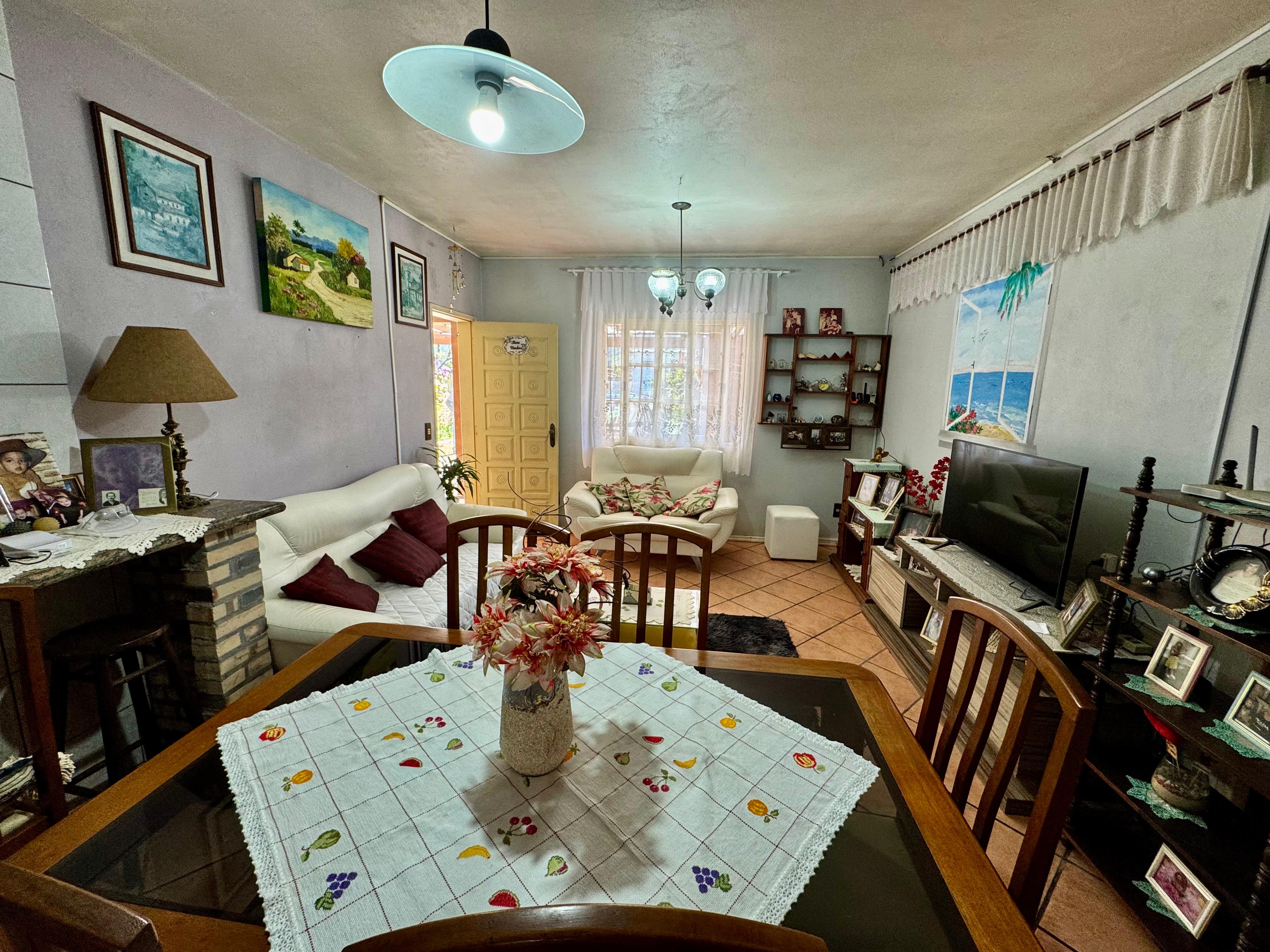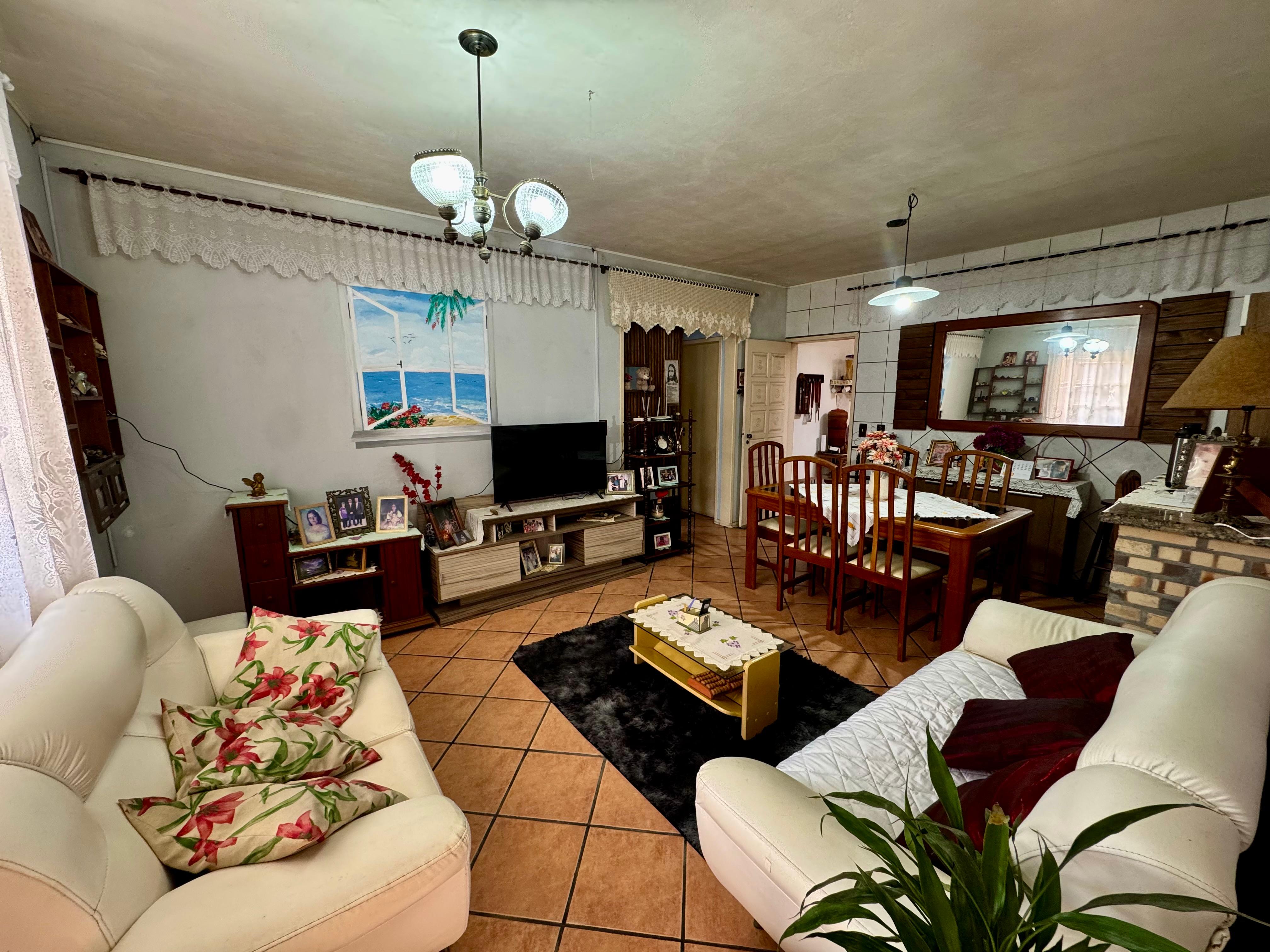 A primeira casa, em alvenaria, possui aproximadamente 100m² e conta com 2 dormitórios, 2 banheiros, sala de estar e jantar integradas, cozinha, lavanderia e área com churrasqueira, oferecendo conforto e praticidade para o dia a dia.